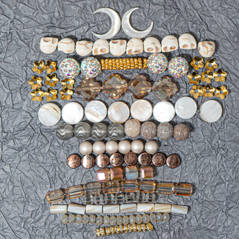 Dive into an elegant moonlit mausoleum with this stunning blend of Autumnal-themed beads. Each mix includes over 100 beads and components to work with, perfect for creating elegant earrings, bracelets, necklaces, and more. Become hypnotized by elegant crescent moon beads, mini skull beads, rhinestone encrusted boho beads, faceted glass shapes, Mother-of-Pearl coins, glass rounds, mini ghostly white glass pearls, copper-plated metal beads, faceted glass rectangles, and more. Largest piece in the mix measures 12mm x 12mm x 4mm. Smallest piece in mix measures 2mm.