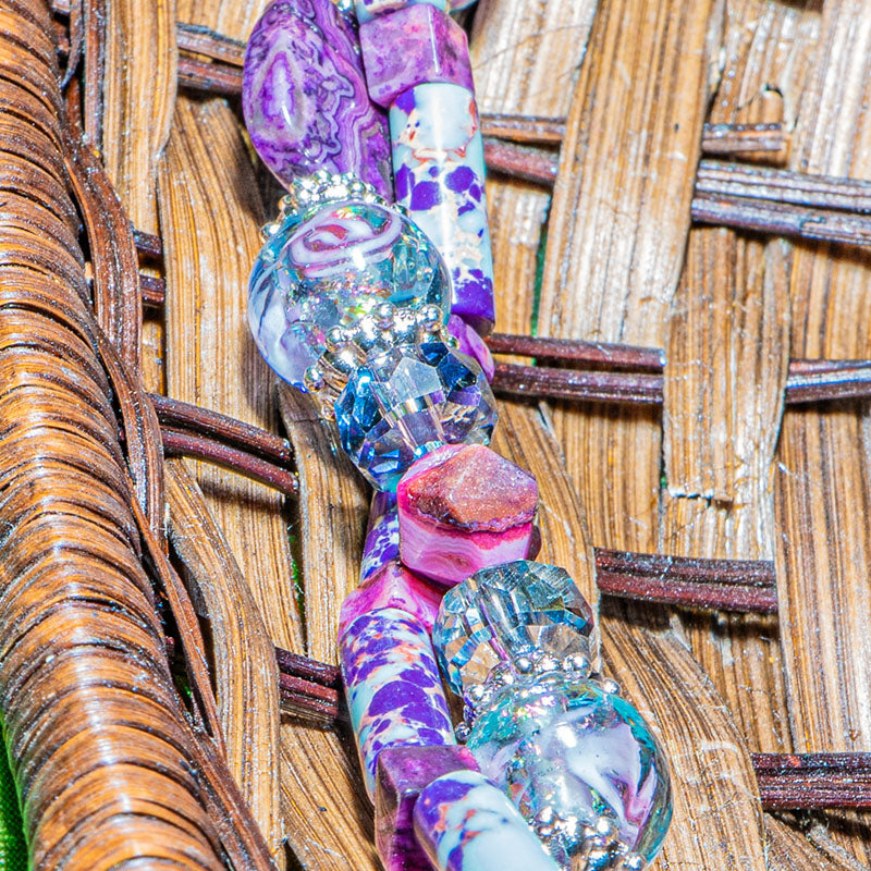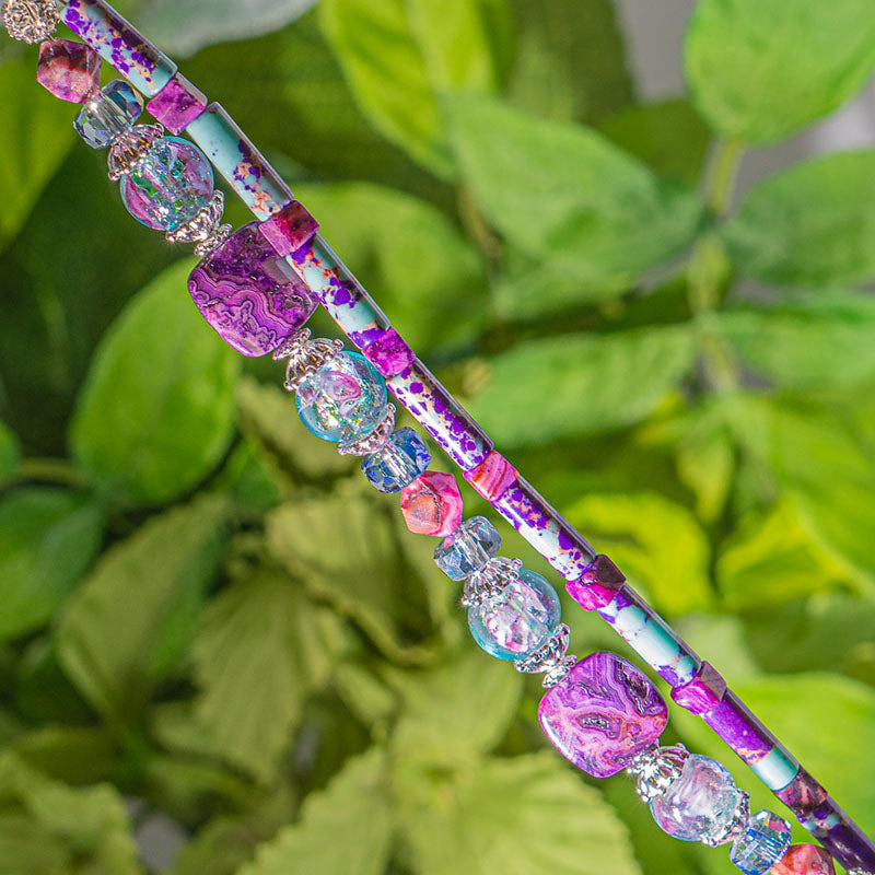 This duo of 5-inch bead strands features an assortment of natural stone jasper beads paired with dichronic glass, faceted glass spacers, and silver-plated brass metal bead spacers. The Natural Jasper beads feature petite tubes and mini cubes as well as flat squares and faceted diamond-cut shapes. Largest 12.5mm x 12.5mm x 4mm. Smallest bead measures 6mm x 2mm.