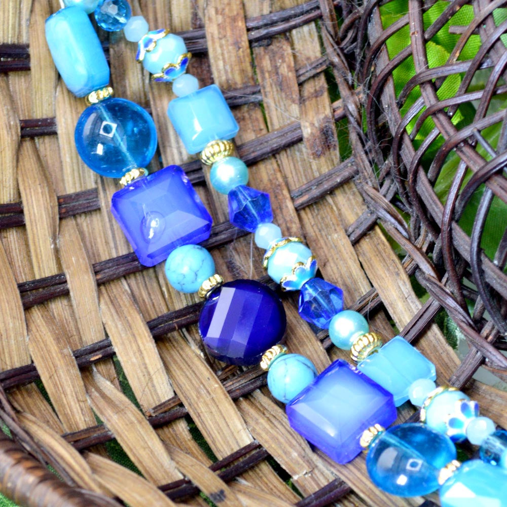 This duo of cool blue 5-inch bead strands features a blend of light and dark blue tones. Perfect for creating earrings, beaded bracelets, and more, this set features a blend of faceted glass and glass beads. Each set includes faceted glass ronelles, faceted glass bicones, glass puff coins, mini glass pearls, crackled ceramic beads, and gold-plated brass metal bead spacers. Largest bead in set measures 13mm x 13mm x 7mm. Smallest bead in set measures 4.5mm.