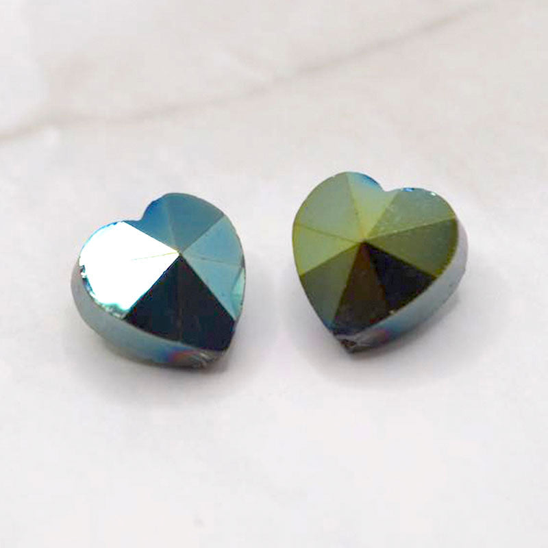 Add a little heart to your next project with these stunning dark blue and green faceted heart shaped beads. Each bead measures 10mm x 10mm x 7mm. 12 per set.
