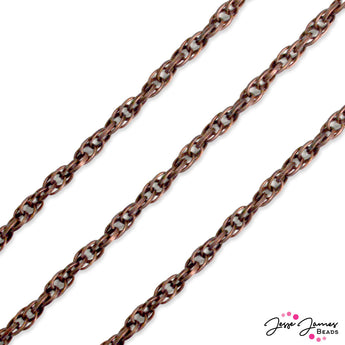 Interlocked curb chain is intricately connected with oval shaped links. Antique copper color gives old world excellence to jewelry projects. Sold in 1 meter lengths. Chain is 4mm thick.