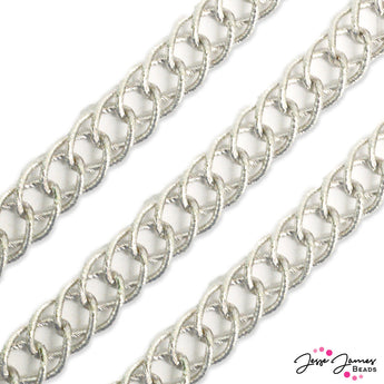 Make waves with this bold statement chain! The motion of the ocean is strong with the Waves Loop Chain from JJB. Textured chain links in a thick and chonky chain style pairs great with larger JJB strands and bead mixes. Make statement jewelry with large chain. Rhodium plated. Sold in 1 meter lengths. Links measure 20mm x 12mm x 2mm.