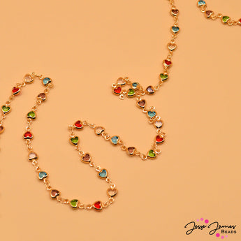 This beautiful chain features mini links of beautiful multi-colored glass! Each link measures 6mm x 5mm x 2mm. This dainty lightweight chain is perfect for earrings, bracelets, necklaces, and more. Chain is sold in 24-inch increments.