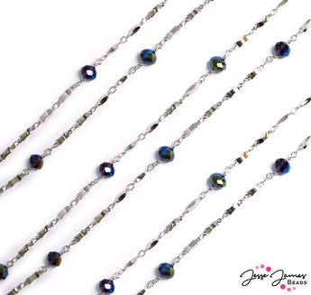 This beautiful rich dark color is elevated with it's AB Finish. A JJB Signature item, the Chain reaction chain is a pre-cut 18-inch chain that is easy to use and beautiful to display in any jewelry project. Each chain includes beautifully plated metals that don't tarnish or fade as they age. Chain features 8x6mm accenting glass beads.