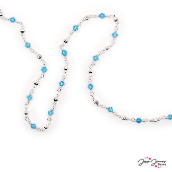 This stunning silver-plated chain features bright teal glass bead links for a pop of color. The chain is sold in 18-inch increments, perfect for creating bracelets, earrings, necklaces, and more. Links measure 4mm thick.
