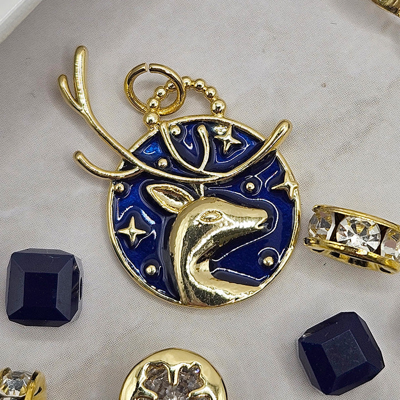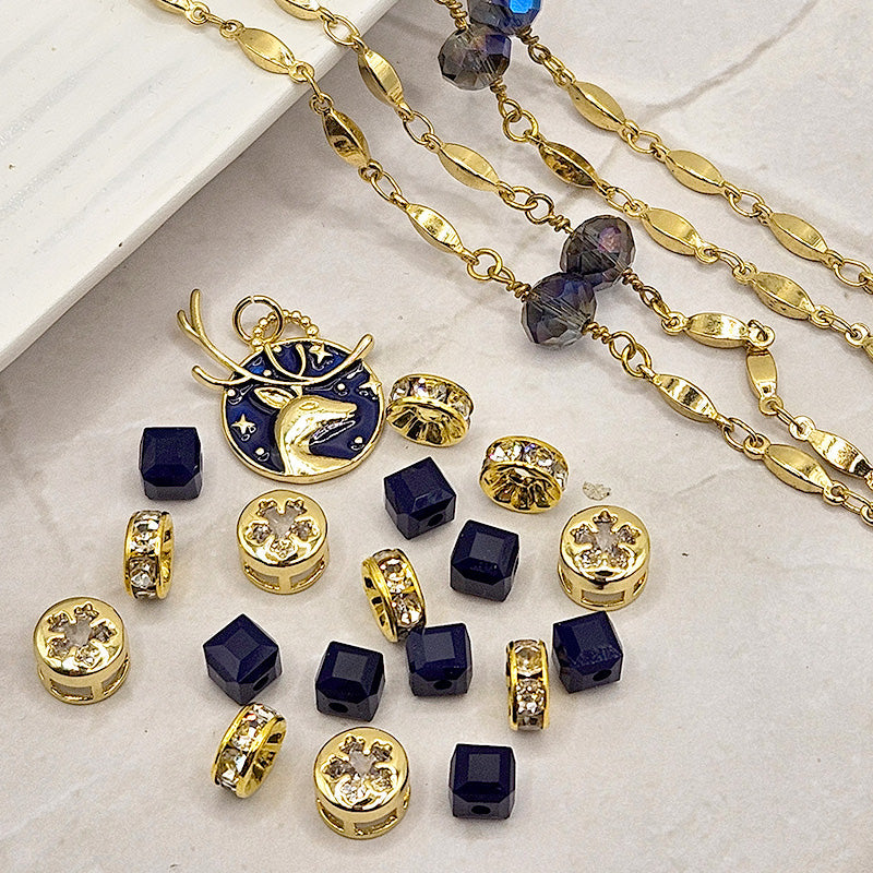 Add a beautiful Winter touch to any jewelry project with this jewelry-ready bundle from Jesse James Beads. Each bundle includes two 24-inch precut JJB signature chain reaction beaded chains paired with a stunning mini bead mix. Each mix includes a beautiful focal gold-plated enamel reindeer chair paired with faceted glass cubes, gold-plated metal slider beads with faceted glass snowflakes, and gold-plated rhinestone spacers. Largest piece in mix measures 24mm x 15.5mm x 2.5mm. Smallest piece measures 4mm x 2mm.