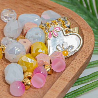 This adorable bead mix features stunning 18K gold plated heart charms featuring a Cadmium Free & Lead Free finish! These charms are accompanied by faceted glass in crystal and yellow colors, mini round pink glass beads, adorable geometric cube beads, gold plated metal bicones, and gold plated metal spacers. Largest piece in mix measures 18.5mm x 17.5mm x 3mm. Smallest piece in mix measures 4mm.