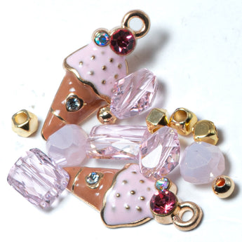 This delightful mix serves up pink glass beads, shiny gold spacers, and two adorable enamel strawberry ice cream cone charms—like a sugar rush in bead form! Perfect for crafting playful, candy-colored accessories that feel like your favorite summer dessert. A lil’ sweet treat for your next DIY project! Largest piece measures 21mm. Smallest piece measures 4mm.