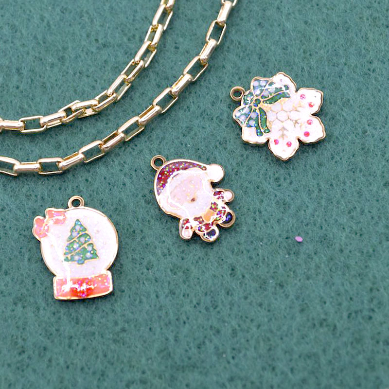 This trio of 304 Stainless Steel Gold-plated charms feature stunning enamel designs. Each trio includes one Santa, one adorable snowflake, and one Christmas tree in a snowglobe. All charms are cadmium-free, nickel-free, and lead free. All charms measures approx 16.5mm in size at their largest points. 1.4mm hole size for each charm.