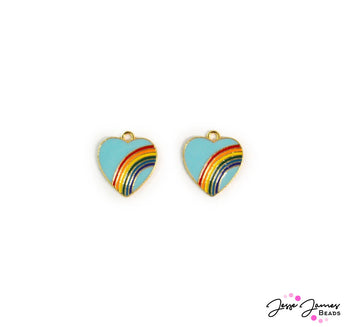 These playful rainbow heart charms feature a bright blue enamel background decorated with an enamel six-color rainbow. These bold and bright colors are designed on a bright gold metal-plated heart-shaped base. Each charm measures 20mm x 18mm x 1.6mm.
