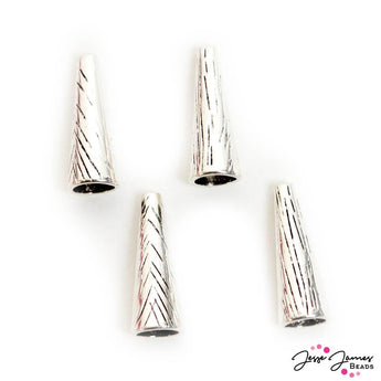 Make your designs shine with these textured silver cones. This 4 piece set is made of plated pewter metals and is perfect for those with sensitive skin. Measures 28mm x 10.3 mm.Diameter openings measure 7.7 mm and 1.5 mm. Lead, nickel and cadmium free.