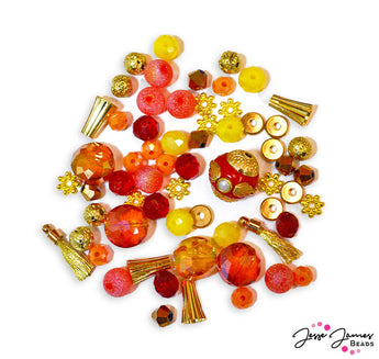 This bead mix features all the beauty of a sunset mixes with luxurious components. Each bead mix features a blend of faceted glass, custom bohos, end caps, metallic gold tassels, frosted glass, and more. Largest bead in mix measures 24mm. Smallest bead in mix measures 6mm.