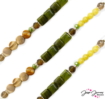 This Earthy toned bead strand features a color blocked design of Dakota Stones natural stone beads. Each 7-inch bead strand features Matte Wood Opalite, Jade, and Heliodor. Largest bead on strand measures 12mm. Smallest bead on strand measures 6mm x 2mm.