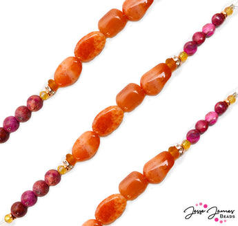 This bold orange and pink bead strand features a color blocked design of Dakota Stones natural stone beads. Each 7-inch bead strand features Pink Crazy Lace Agate in 2 styles and Orange Chalcedony nuggets. Largest bead on strand measures approx 14mm x 20mm. Smallest bead on strand measures 4mm.