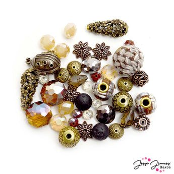 Enjoy a night by the fireplace reading a good book. This Light Academia inspired bead mix features warm brown and antique gold tones. Each mix includes sweater wrapped beads, faceted glass, focal cage pendant, metal focal beads, metal spacers, and more. Largest bead in mix measures 26mm x 24mm. Smallest bead in mix measures 6mm.