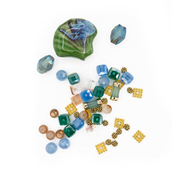 This stunning seaworthy bead mix features a large ceramic focal bead accenting with stunning faceted glass, glass cubes, electroplated glass, gold-plated metal bead spacers, and more. Largest bead in mix measures 29mm x 32mm x 13mm. Smallest bead in mix measures 4mm x 2mm.