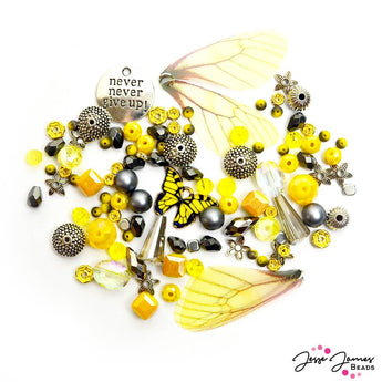 Never, Never Give Up! This bright bead mix reminds you to always follow your dreams and creative desires. Features Czech Glass, metal spacers, floral bead caps, a Tiger Swallowtail butterfly charm and matching chiffon wing charms, and an engraved metal charm. Largest bead measures 16.2mm X 8.3mm. Charms measure approximately 18.6mm.