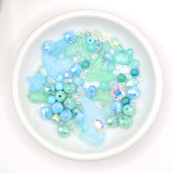 This stunning blend of glass and acrylic beads features shimmering mermaid tails, mini crab beads, starfish, and more. Largest bead in mix measures 20mm x 20mm x 3.5mm. Smallest bead in mix measures 4mm.