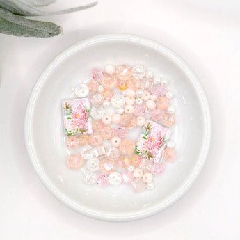 This pastel pink bead mix features beautiful rondelles, cubes, and bicones in beautiful pink hues. This mix also includes 2 beautiful floral focal pieces perfect for designing earrings, bracelets, and more. Largest bead in mix measures 21mm x 16mm x 4.5mm. Smallest bead in mix measures 4mm.