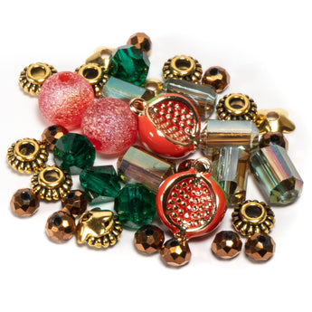 Celebrate the richness of nature with this pomegranate fruit-themed bead mix, featuring elegant Brass Enamel Pomegranate Charms, deep green faceted glass, dark AB crystal glass, and antique gold-plated metal spacers. Opaque brown mini faceted glass beads, glitter faux pearls, and antique gold bead caps complete this sophisticated set, perfect for adding a touch of opulence to your jewelry designs. Largest piece in mix measures 11.5mm x 10mm x 6mm. Smallest piece in mix measures 4mm. Bead hole sizes range from 1mm to 2mm.