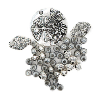 This playful bead mix features a custom JJB metal pendant with a lily pad design. This pendant is accented with stunning matching metal beads and spacers. Includes metal colored Seed Beads. Largest piece measures 25mm x 25mm x 4mm. Smallest bead measures 6mm.