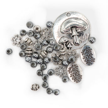 This playful bead mix features a custom JJB metal pendant with a mushroom design. This pendant is accented with stunning matching metal beads and spacers. Includes metal colored Seed Beads. Largest piece measures 25mm x 25mm x 4mm. Smallest bead measures 6mm.