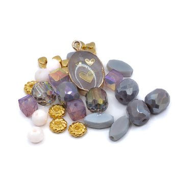 This dusty purple toned bead mix features a stone focal charm adorned with gold hearts, faceted glass, mini gold plated hearts, and gold plated bead spacers. Largest piece: 22mm x 13mm x 5mm. Smallest piece: 4mm.