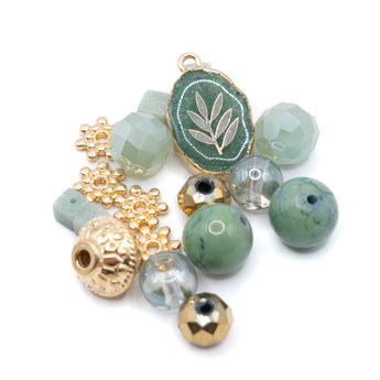 Unlock your inner nature lover with this stunning green bead mix. This mix features a stone focal charm, faceted glass, smooth agate rounds, and gold metal accents. Largest piece: 22mm x 13mm x 4.5mm. Smallest piece: 5mm.