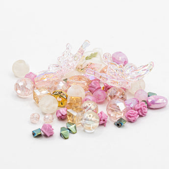This vibrant pink bead mix features a unique blend of faceted glass, mini acrylic roses, rhinestone spacers, and more. Largest bead in mix measures 24mm x 24mm x 10mm. Smallest bead measures 4mm.