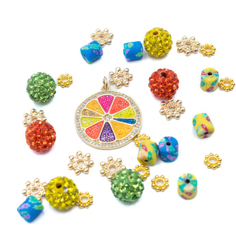 Dive into a sweet and tangy bead mix with these bright fruit inspired colors. Each bead mix features an assortment of glass and acrylic beads paired with a stunning fruit slice focal. Largest piece 25mm x 22mm x 2mm. Smallest piece 4mm x 2mm