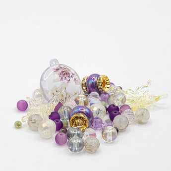 This stunning purple bead mix features an assortment of faceted glass, rhinestone spacers, acrylic butterflies and more. Largest piece in mix measures 28mm x 25mm x 4mm. Smallest bead measures 4mm.