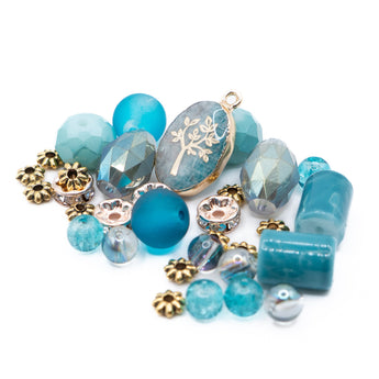 Dive into the mystic with this stunning teal bead mix. This mix features a stone pendant accenting with bold glass and electroplated glass beads. Largest piece: 22mm x 13mm x 5mm. Smallest piece: 5mm x 2mm.