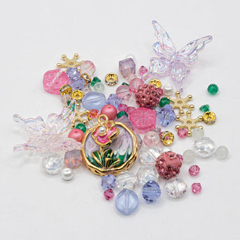 This bold blend of Spring-inspired beads features stunning glass, acrylic, gold-plated metal, and more. Each mix features butterfly beads in stunning tansluscent AB acrylic, rhinestone encrusted boho beads, rhinestone spacers, a floral charm, and more. Largest bead in mix measures 25mm x 22mm x 6mm. Smallest bead in mix measures 4mm.