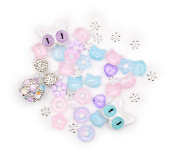 This adorable cat themed bead mix features adorable white cat focal beads, focal boho bead, jelly-style glass kitty heads, jelly glass rings and stars. Smallest beads measure approx 10mm x 12mm. Largest bead measures approx. 22mm x 18mm x 10mm.