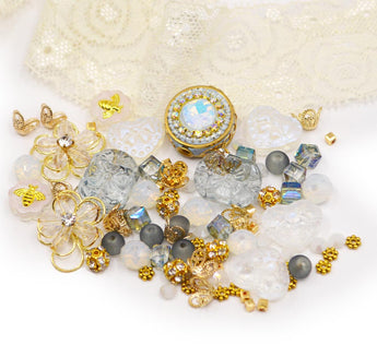 A delicate blend of sage green, gold, and crystal beads, this mix shimmers with soft elegance and vintage charm. Each piece adds a touch of sparkle, perfect for creating jewelry that's both romantic and refined. This mix includes large sage bohos, gold and crystal flowers, rhinestone spacers, hearts with bow and bees. Largest bead measures 21mm. Smallest bead measures 3mm.