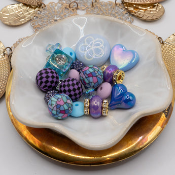 Dive into dreamy hues with this purple and blue silicone bead mix, featuring eye-catching patterned beads and playful spacers. It's the perfect combo for creating magical bracelets, bead-able pens, and keychains with a pop of color and charm! 20 pieces per mix. Each mix features an assortment of silicone beads, acrylic, clay rhinestone mini bohos, and rhinestone spacers. Largest bead measures 25mm x 25mm x 11mm. Smallest bead measures 10mm.