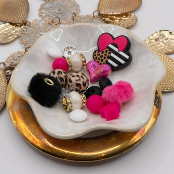Fierce meets fabulous in this dark pink, black, and animal print silicone bead mix, featuring bright acrylic beads, bold large-hole accents, and playful spacers. Perfect for creating eye-catching bracelets, bead-able pens, and keychains with a wild twist! 19 pieces per mix. Each mix features an assortment of silicone beads, acrylic beads, glass beads, and rhinstone spacer beads. Largest bead measures 27.8mm x 31mm x 8mm. Smallest bead measures 10mm.