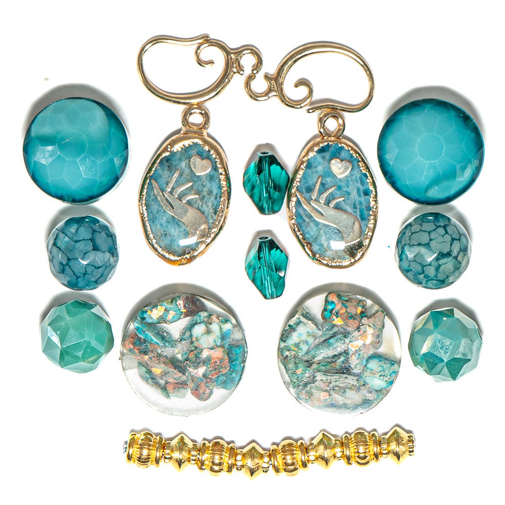 This stunning bead mix features two faux stone charms, resin coins, faceted glass beads, gold-plated metal spacers, and a pair of ear wires for easy earrings!