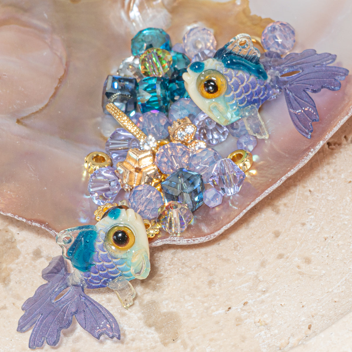 This adorable limited edition bead mix features a playful blend of purple and blue tones for jewelry making. Each mix includes two adorable koi fish charms paired with faceted glass and gold-plated metal beads. Ear wires included for easy earrings.