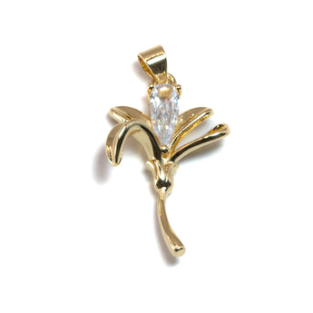 This elegant flower charm sparkles with micro pave cubic zirconia and is richly plated in real 18K gold for a luxurious finish. Lead- and cadmium-free with a generous hole size, it's perfect for stringing onto chains or ribbon for effortless floral flair. Measures 28.5x17x8.5mm.
