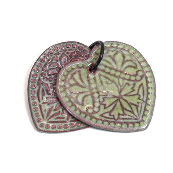 Add a handcrafted touch to your designs with this enameled heart pendant from Gardanne Beads, featuring an art deco floral pattern on both sides and a recessed back. Made from enamel-coated brass in olive green with reddish-brown undertones, this 24mm x 22mm pendant includes a 1.5mm top hole—perfect for stringing onto chain, cord, or wire. Sold individually.