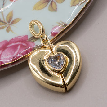 This playful heart pendant features a stunning gold-plated metal shell protecting your mini treasure. Each locket measures 21mm x 18mm x 8mm. Holds a 8mm x 9mm sized photo.