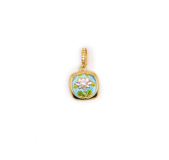 This square-shaped pendant features a delicate floral motif in glossy light cyan enamel, accented with a luminous natural freshwater pearl for an elegant organic touch. A sparkling micro pave cubic zirconia clasp adds a hint of brilliance, all set in gold-tone brass for a luxurious finish. Measuring 21x18x5mm with a generous 8x5mm hole, it’s ideal for pairing with bold chains, beaded strands, or statement cords. Perfect for springtime looks or romantic styles, this pendant blends softness, sparkle, and sophistication in one enchanting piece.