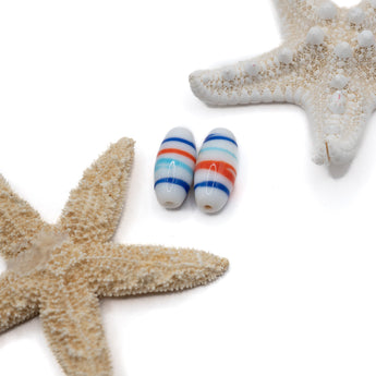 Ahoy matey! These hand-painted ceramic beads feature Buoy inspired stripes of color on a white base. Due to the hand-painted nature of these beads, the stripes may vary in color and size. Each bead measures 22.5mm x 9mm. Beads are sold in sets of 2. Hole size 2mm.