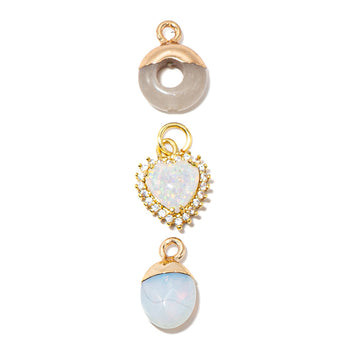 This adorable set of mini stone charms features a donut charm, a heart-shaped faux opal heart charm, and an agate stone drop charm. Each charm measures approximately 14mm in size, perfect for adding to stackable bracelets, necklaces, and more.