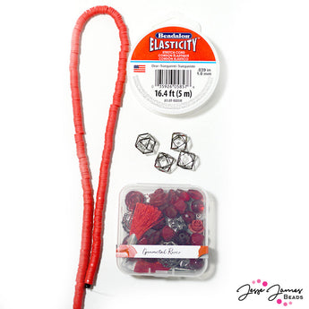 For those who love to live on the wild side. This bold blend of red and black beads are the perfect giftable bundle for anyone who love to make stretch bracelets. Each bundle includes a 14 inch strand of heishi beads, a color trends bead mix in gunmetal roses, a four piece set of gunmental 12mm caged crystals, and a spool of beadalon Elasticity.