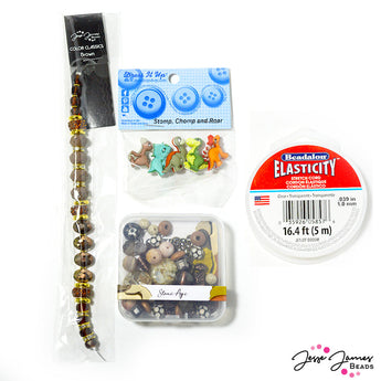 Who doesn't love a good piece of dinosaur themed jewelry? This fun and whimsicle blend of beads features a stone age color palette with a twist. Each bundle includes 1 color classics bead strand in Brown, 1 Stomp, Chomp, and Roar embellishment pack from Dress It Up, one color trends bead mix in Stone Age, and a spool of elasticity. This bundle of beads is perfect to mix and match to create adorable stretch bracelets, perfect to give as a gift!