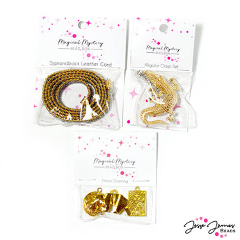 See ya later, glamour gater! This bright, golden-plated metal assortment features the Diamondback Leather cord and Alligator Findings set from the Welcome To The Bayou Box paired with The Prince Charming Charm set from the Fairy Tale Follies box. These adorable items make up their sparkling bead bundle, perfect for creating adorable bracelets and more.