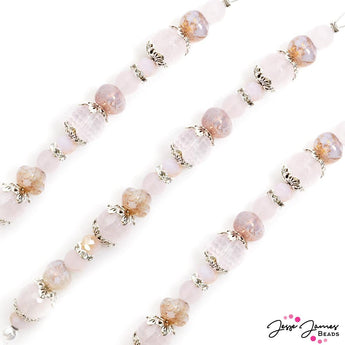 The Heart Chakra is our energy point for love, compassion, empathy and forgiveness. This chakra governs our senses of gratitude, connectedness and peace. Though color for this chakra is green, pink Rose Quartz helps activate this energy point by opening the heart to all forms of love - love of self, family love, love of friends, romantic love, love for animals...the list goes on! This strand features 10mm faceted rose quartz beads and 6mm matte rose quartz rounds, both from Dakota Stones, as well as vintage Czech glass nuggets, sparkling rhinestone spacers and beautiful silver color bead caps. The largest bead on strand measures 10mm. This Heart Chakra bead strand was hand-designed with love by the Design Team at Jesse James Beads