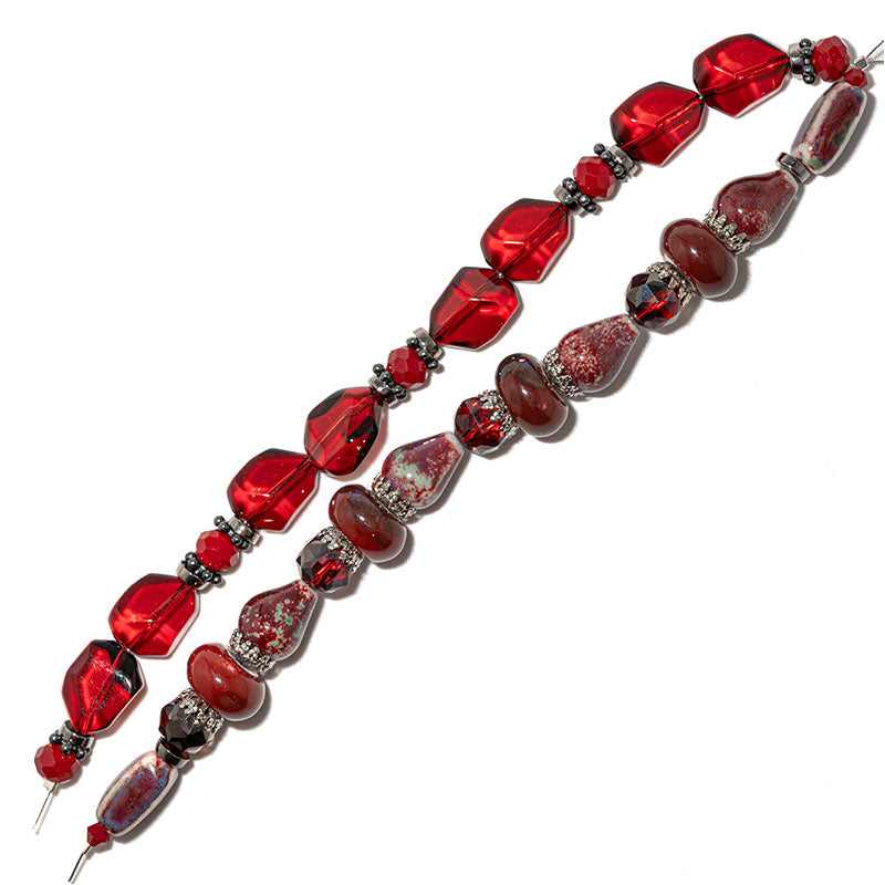 This stunning dark 6.5-inch bead strand duo features beautiful ceramic-style cherry red beads paired with glass and antique silver-plated brass metal. This duo of 6-inch strands features stunning ceramic large hole beads, ceramic teardrops, ceramic rectangle shapes, faceted glass rondelles, mini glass bicones, and faceted glass organic shapes. Largest bead measures 16mm x 12mm x 7.5mm. Sallest bead measures 5mm x 2mm.